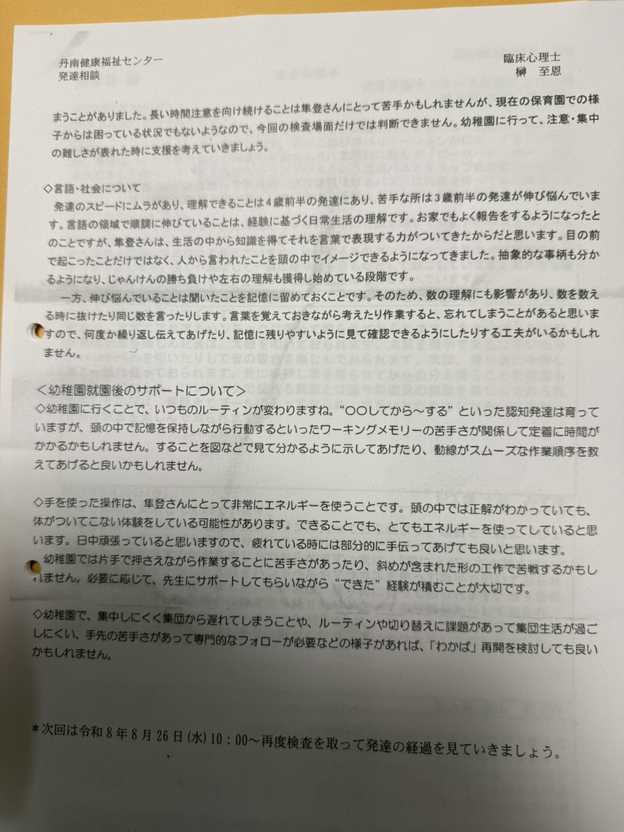 | 児童の特徴 | この4月から岡野幼稚園に通う。かなり伸びており、支援に関しては幼稚園で終わる思われる。 動きの連動、手先の不器用さ(これが一番)、階段の上り下りが怖い、片足立ちの上肢と下肢の連動が苦手、2つの動作の組み合わせが苦手、ボディイメージが苦手、短期記憶が苦手であるため、動きながらいろんなリズムを楽しみながら身体と須高のつながりを行います。 ・3回の保護者連絡 本日は、様々な身体活動を楽しみながらすごしました。足で弾くピアノでは、足を使って鍵盤を踏み、音が鳴ることを楽しみながら身体の使い方を体験しています。 毛布ソリでは、引っ張られる動きの中でバランスを取りながら、スピード感や身体への刺激を楽しむ様子が見られました。滑り台では、座布団に乗り他児と一緒に滑り、スピードや揺れなどの前庭感覚を感じなが笑顔で遊ばれていました。ロープ遊びでは、ロープを使って釣りに見立てた遊びを行い、想像力を膨らませながら活動されています。 お散歩では、「電車を見たい」とのことで線路の近くへ行き、JRの電車を見て楽しみました。公園では足つぼの上を走る競争を行い、足裏への刺激を感じながら元気いっぱい身体を動かされています。帰りには電車ゴッコを行い「ハヤブサ」「こまち」になりっきって走り回り、最後まで元気いっぱい活動されていました。様々な遊びを通して、身体のバランスや足裏の感覚、全身の動きなどを感じる感覚統合遊びを取り入れながら過ごしました。 今日も元気に来所してくれています。 今日は、えがおにつくとまずお友達と毛布そりに乗っておられます。うちわをもって立った状態で毛布を引っ張ってもらって途中うちわを扇いでみたりもしながら、バランス感覚の刺激を行いながら前庭覚の刺激を楽しんでおられます。次は、ビー玉転がしやボール転がしをしておられます。始めは、竹を2つ並べてボールの滑り台を作るとその上でボールを転がしたり、ビー玉転がしではビー玉を転がす滑り台を自分で作って転がしておられ、指先の微細運動を行いました。その後は、テントを引っ張ってきて、中に入るとごろんと寝転がって「閉じ込められてしまった~でられなーい、たすけて~」といって職員に助けてもらうのを待っておられたので、職員がテントの上からくすぐる「ひゃはは!」と笑って転がりながらテントから抜け出しておられ、固有受容感覚の刺激を行いながら触覚の刺激も行いました。 今日も元気に来所されています。 シーツのお魚釣りでスピードを上げて職員が走ると大喜び。スラックライン下をくぐる際には身体を低く縮めて当たらないようにすり抜けておられます。他児が座ったまま並んでいると優しく頭をかがめるようにサポートしてくれておられました。隼登君をお兄さんのように慕っている子もいます。ダンボールのソリに乗り物を変えると、他児を乗せて引っ張って走っておられました。重力を感じて上肢で引っ張るだけでなく、下肢の筋肉へも負荷がかかることによって上肢と下肢の統合遊びにつながっています。固有受容感覚の刺激にもなります。 大きなウレタン積み木に車輪もつけて車を作るとご自分で乗ったり滑り台で滑らせたり、イメージを形にして、ストーリーを想像して遊んでおられました。バランスボールを抱えて運んだり、小さなスーパーボールも指先でつまんで集めて転がすなど滑り台では粗大運動から微細運動を楽しまれました。 |